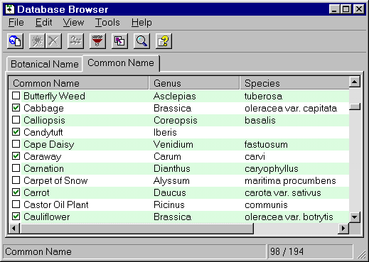 As explained in the upcoming section on Custom Views, you can also use the Database Browser to search the plant database for plants which meet desired characteristics. You can use any plant characteristic stored in the plant database for your searches. Sharing Your Plant DatabaseA new feature added in version 1.8 of SeedPlanner is the ability to share your plant database with other growers. Also, we will be providing updated databases on SeedPlanner.com's Updates page. All you need to do is download the database from our web site or copy it from an e-mail sent to you by a fellow grower, enter the database browser and select Update Database from the menu. You have complete control over which plants are added to your database, and if you keep all the files you can add plants only as you need them. Common Name SupportSeedPlanner allows you to use both Botanical (Scientific) plant names or Common names, depending on which you are most comfortable with. Again, you use the Database Browser to control the use of common names. You can easily add new common names, modify common names, or select which common names you want to use.
