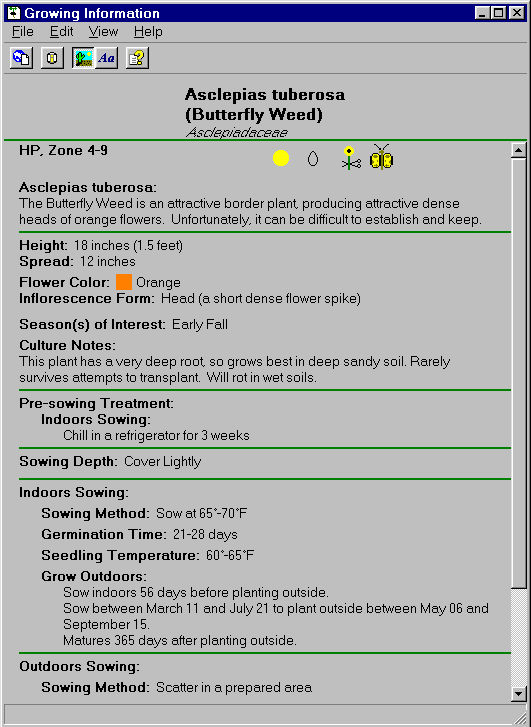 The Plant DatabaseSeedPlanner offers a comprehensive plant database, which contains seed starting instructions, tips, and trouble-shooting for hundreds of plant species. Included in the plant database are perennials, vegetables, annuals, herbs, shrubs, trees, and biennials. Unlike most other gardening software currently available you are in complete control of the plant database. You can easily add new plants, delete plants, or modify any of the information in the plant database. The plant database stores a great deal of useful Growing Information for each plant. SeedPlanner provides a special Growing Information window which you use to view a plant's Growing Information. This sample display shows the type of information stored in the plant database.