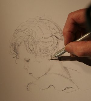 A silver “lead” called a stylus is used to etch the drawing on paper coated